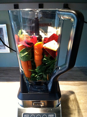 She recommends experimenting with a variety of super foods and mixing up the ratio of fruits & veggies. In addition to the below she adds to the blender a pinch of organic cranberry or pomegranate juice and a little water with a handful of ice. Here is her recipe from this morning. This makes two, large glasses.